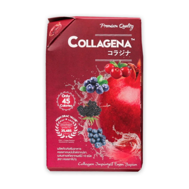Collagena อุดมไปด้วยวิตามิน B3 C E จากผลไม้มากถึง 10 ชนิด ได้แก่ ทับทิม สตรอวเบอร์รี่ บลูเบอร์รี่ ราสเบอร์รี่ เอลเดอร์เบอร์รี่ บิลเบอร์รี่ อาเซโลราเชอร์รี่ โกจิเบอร์รี่ แครนเบอร์รี่ และมะขามป้อม รสชาติดีเหมือนน้ำทับทิม ไม่แต่งสี ไม่แต่งกลิ่น ดื่มง่ายไม่คาว